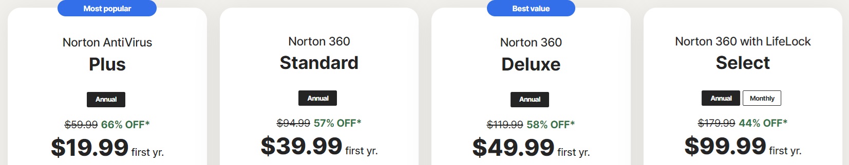 Οι υφιστάμενοι πελάτες μπορούν να επιλέξουν από διάφορα κουπόνια Norton που έχουν ως στόχο να τους προσφέρουν τις καλύτερες εκπτώσεις. Για παράδειγμα, μπορούν να κερδίσουν πάνω από 80% έκπτωση για ένα ετήσιο πρόγραμμα συνδρομής ή μπορούν να εξοικονομήσουν έως και 60% έκπτωση σε επιλεγμένα προϊόντα.