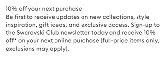 | Promotion | Πάρτε 10% προώθηση στο Swarovski.com εγγραφή | 22 Νοέμβριος |