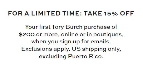 | Promotion | ToryBurch.com προώθηση: 15% έκπτωση πρώτη παραγγελία πάνω από USD200 email Εγγραφή | 08 Ενδέχεται |